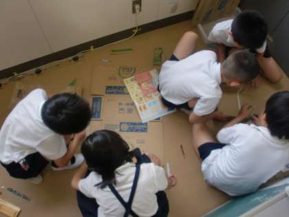 3年2組は、6月18日(土)の豊仁祭で「がんばれUFOキャッチャー」をします。今日は、その準備物の製作をしました。