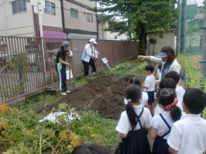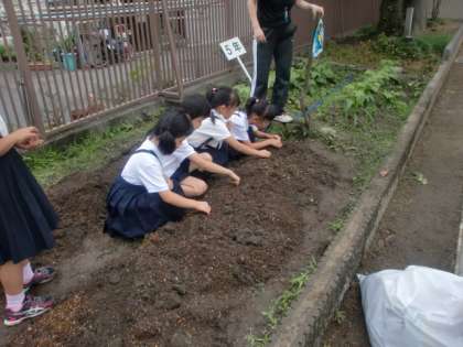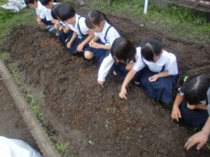 学習園に種を蒔きました。蒔いた種は、ヒマワリ、トウモロコシ、フウセンカズラです。しっかり世話をして大きく育ててくださいね。