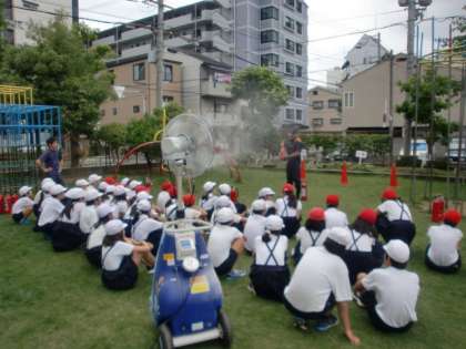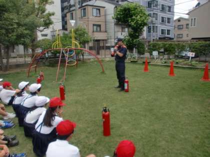 水消火器(薬剤の代わりに水を入れた消火器)を実際に使って、消火器の使い方を体験しました。