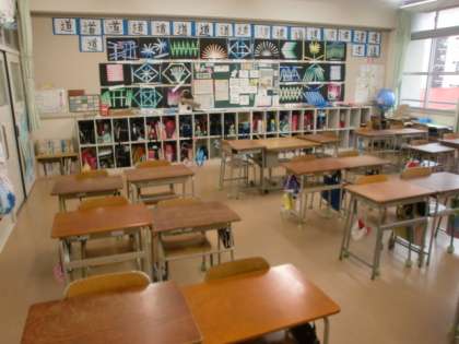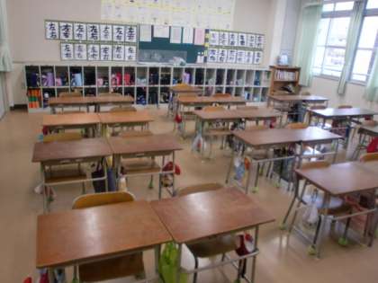 机がきれいに揃って、全員のイスが机の中にしまってありました。机の上にも何もありませんでした。