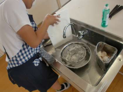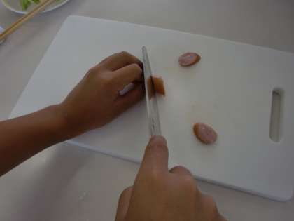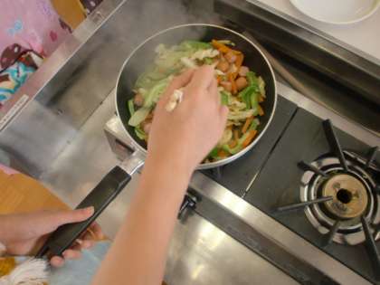 フライパンを使って野菜とソーセージの炒め物、スクランブルエッグを作りました。