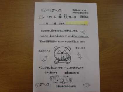 むし歯が一本もなかった人(治療済みも含む)に、保健委員会からむし歯0カードが渡されました。今日は3年1組でむし歯0の人に渡されました。