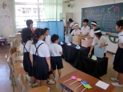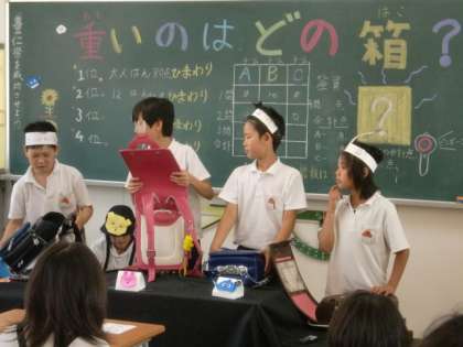 お店の人がとても重そうに持っています。でも、本当に重いのはどれでしょう。みんななかなかの演技力でした。