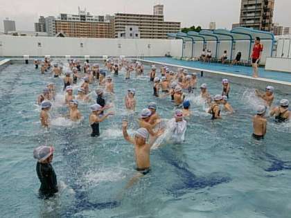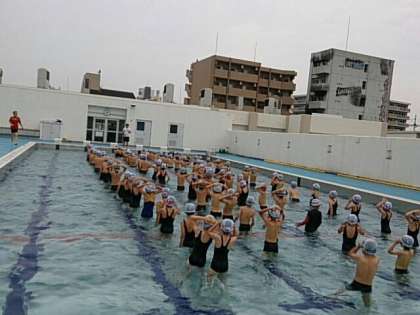 待ちに待ったプール水泳が始まりました。今日は、1年生、2年生、3年生、4年生が入りました。あいにくの曇り空でしたが、気温が高かったので何とか入ることができました。