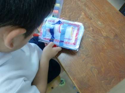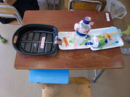 ペットボトルやトレイなど身の回りの材料を使って水に浮かぶおもちゃを作っています。