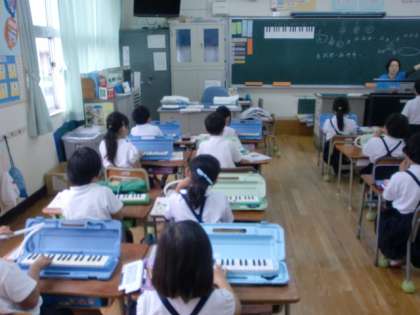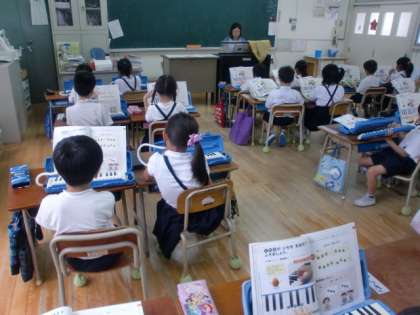 1年1組、2組 音楽科 「どれみのいちをおぼえてふきましょう」