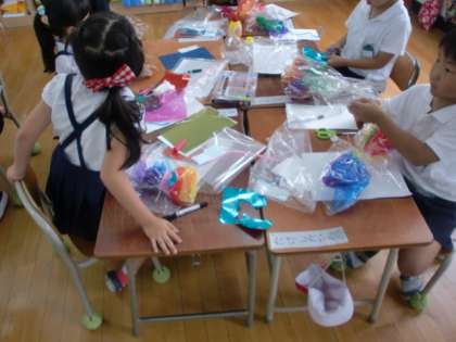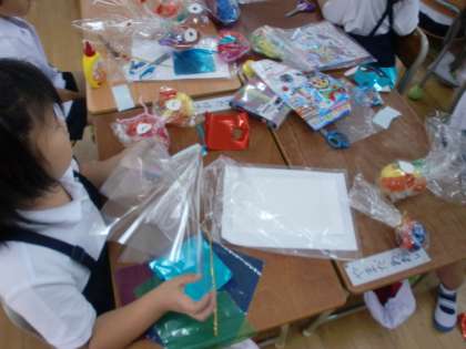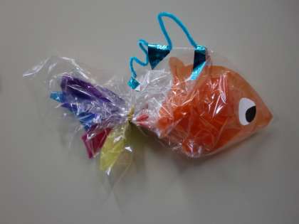 透明のビニル袋の中に、きれいな色のセロハンを入れて動物を作ります。