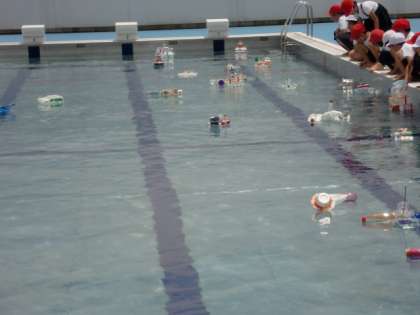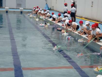 この前から作っていた「ぷかぷか ゆらゆら」をプールに浮かべてみました。最近は、子ども達が遊べるような水辺はありませんから、とても楽しそうでした。