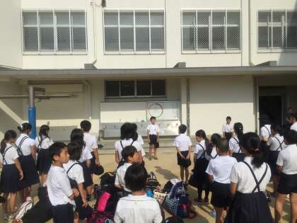 5年生は、今日から三日間の林間学習です。 運動場で出発式を行ってバスに乗り込みました。