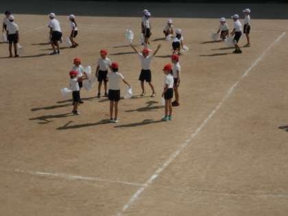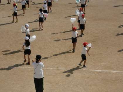 運動場に出て、運動会の練習をしています。音楽を覚えたり、踊りを覚えたり、隊形と場所を覚えたりと大変ですが、どの子も一生懸命です。