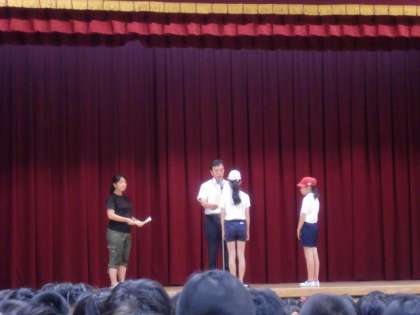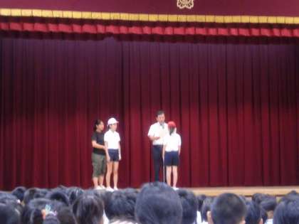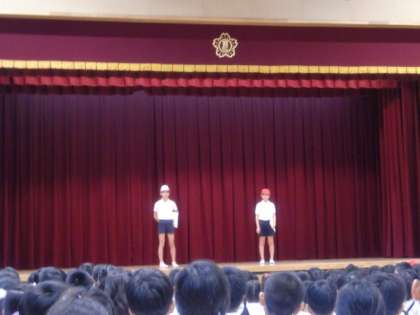 今年の運動会の応援団長は、白組が6年2組の伊東さん、紅組が6年1組の宮本さんです。今日は、校長先生から任命書と団長はちまきが渡されました。