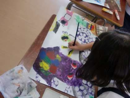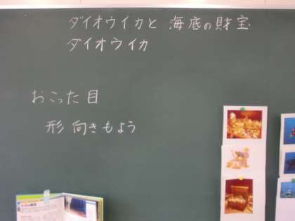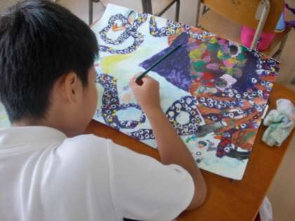 「ダイオウイカと海底の財宝」というお話を聞き、想像を膨らませて絵の具で描きました。
