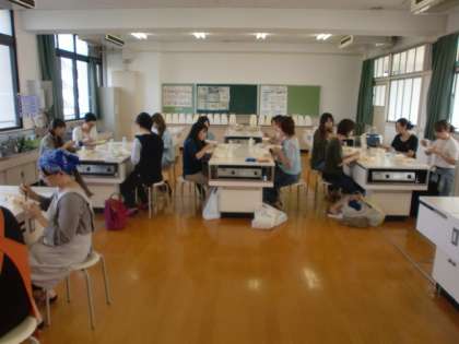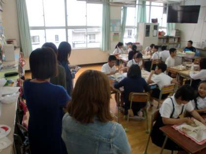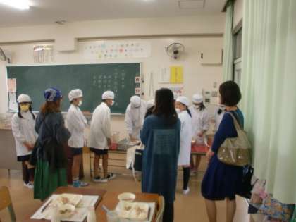 はじめに各学級の給食の様子を見学して、そのあと家庭科室で、給食を試食しました。