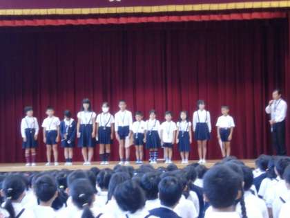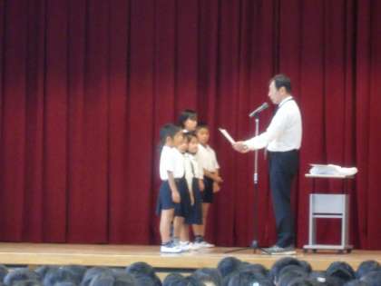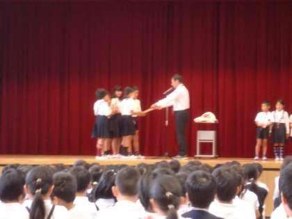 昨日の北区民カーニバル小学生リレーで、金メダルに輝いた高学年チームと、銀メダルの低学年チームの表彰式を行いました。