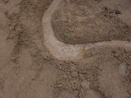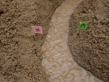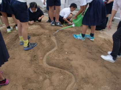 川による浸食、堆積を校庭の山を使って実験しました。小さな川ですが、実際に水を流してみると水が土を削っていく様子と土が積もっていく様子がとてもよく分かりました。
