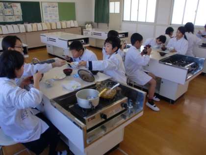 今日は2組の調理実習でした。私が見に行った時には、もう「いただきます」の直前で、みんなうれしそうな顔をしていました。ご飯が少しこげてしまった班もありましたが、これも勉強です。