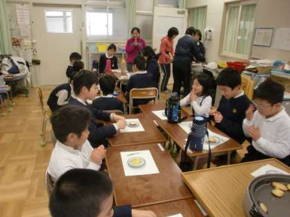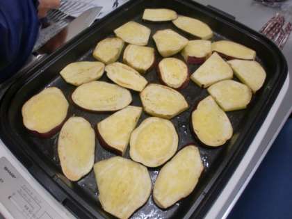 秋に収穫したサツマイモをホットプレートで焼きました。焼いているうちに、とてもいい匂いがしてきて、どの子も食い入るように見ていました。