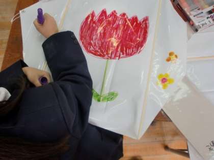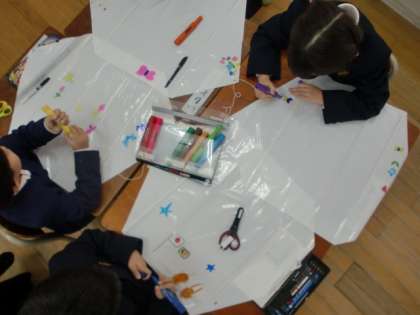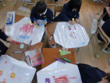 1年生は今、凧づくりに取り組んでいます。自分の好きな絵を描いた世界に一つしかない自分だけの凧です。