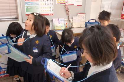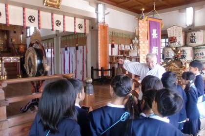 町の中にある施設でインタビューをしました。3つのグループに分かれ、長柄八幡宮、北図書館、天八郵便局に行きました。