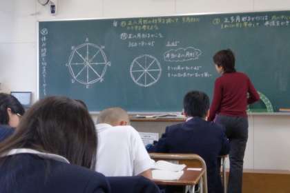 正多角形の作図をしながら、その性質について理解します。今日は、正八角形の性質を調べて、正八角形を書きました。