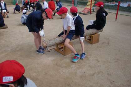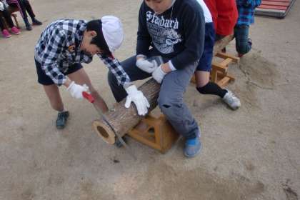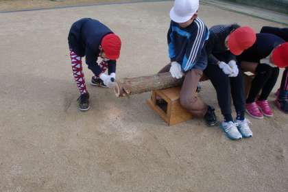 のこぎりで丸太を切りました。子ども達の中でのこぎりを使ったことの子はほとんどいなくて、「こんなにしんどいと思わへんかった。」と木を切ることの大変さを体験しました。