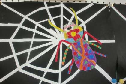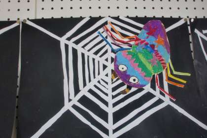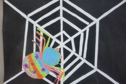 クモの巣は、はさみでジョキジョキ、紙をまっすぐに切って作りました。