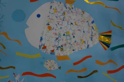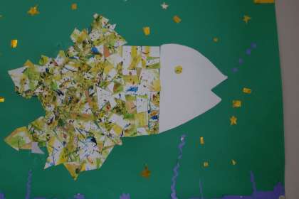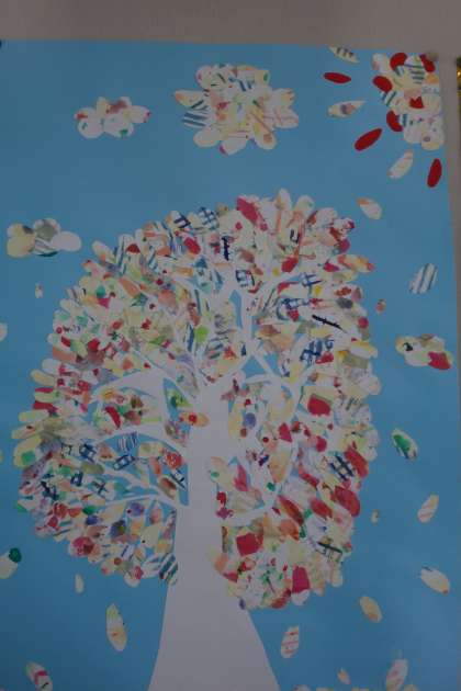 自分で色をつけた紙を切って、それを貼り合わせて、自分の好きな絵を描きました。