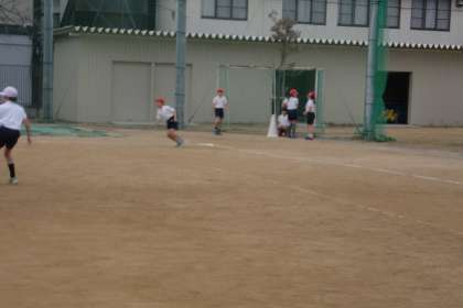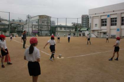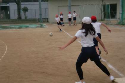 体育科でキックベールボールをしています。ゲーム型のスポーツなので楽しいのですが、ルールが難しく、野球を知らない子どもにはなかなか大変でした。やっとゲームが楽しめるようになってきました。