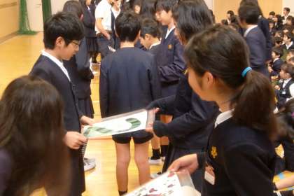 6年生がもうすぐ卒業するので、たてわり班の引き継ぎを行いました。版のカードを6年生から5年生の代表に渡しました。5年生のみなさんよろしくおねがいします。