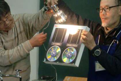 コアネット関西の方々に来ていただき、理科特別授業を行いました。まず、炭にアルミはくを巻き付けて「木炭電池」を作りました。その他にも「光電池」「風力発電」も実験しました。身近な道具で電気が作れるなんて面白いですね。