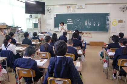 フッ素と府の前にむし歯になる仕組みについてのお話を聞きました。2クラスとも「とても、行儀がよくて、しっかりと聞いてくれました。」とほめていただきました。