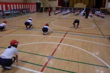 1年生全体での体育科です。体つくりの運動で「かえる跳び」をしています。ピョンピョンと軽快に跳んでいました。