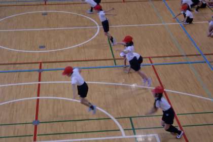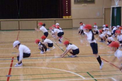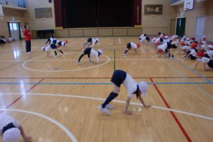 講堂で、跳んだり跳ねたりする運動遊びをして、いろいろな体の動きを楽しみました。