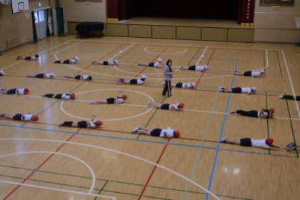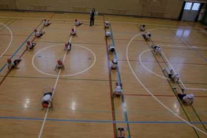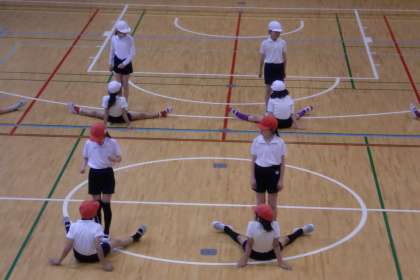 講堂で、体をほぐしたり、力強い動きをしたり、体の柔らかさを生かしたりする運動をしています。