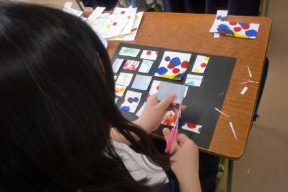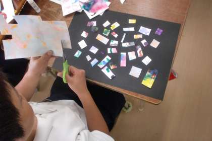 さまざまな技法を使って偶然できた模様。それを切り取って、画用紙に貼り付けていき「心のありよう」を表現しました。