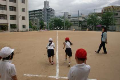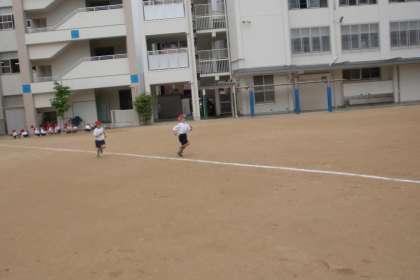 運動場で50メートル走のタイムを測りました。豊仁小学校は運動場が狭いので対角線に沿って走ります。