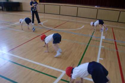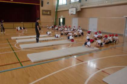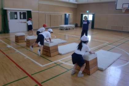 マットの上でいろいろな方向に転がったり、体を支えたり、跳び箱に飛び乗ったり、跳び下りたりと様々な運動遊びをします。