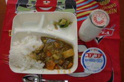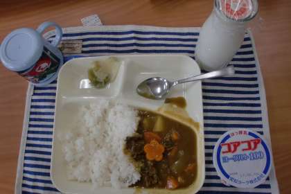 今日の給食は「牛肉と大豆のカレーライス」でした。運よくラッキーにんじんが入っていいる子がいました。ラッキーにんじんの形は「星型」ではなく、「花の形」でした。