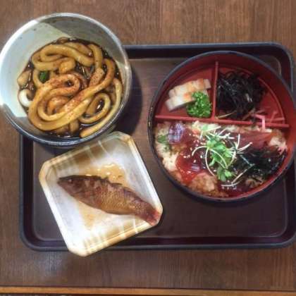 鳥羽の七越茶屋でお昼ご飯。メニューは、手ごね寿司、伊勢うどん、それに昨日釣った魚を一人におよそ1匹。