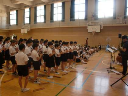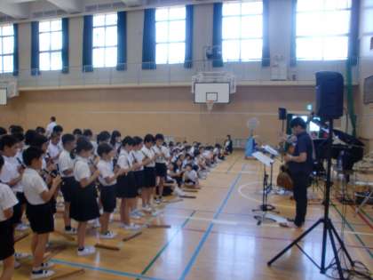 高学年の児童が演奏するリコーダーと一緒に演奏をしてくださり、素敵な曲になりました。