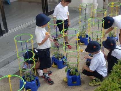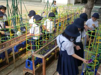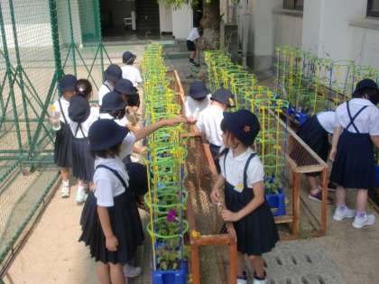 先週の終わりごろから、1年生のアサガオが花をつけはじめ、今日はたくさんの花が咲きました。まだの子もいますが、もう少しで咲くでしょう。