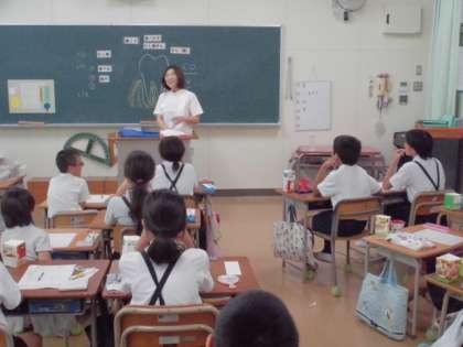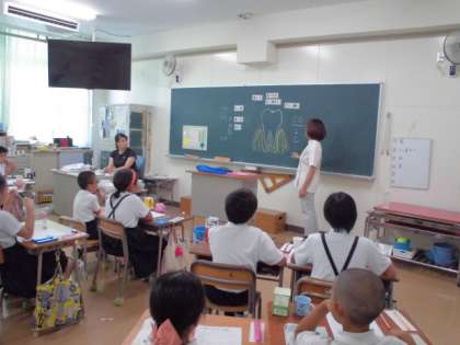 歯科衛生士の方に来ていただき、むし歯のしくみや歯磨きの意味について学習しました。その後、フッ化物塗布をしていただきました。