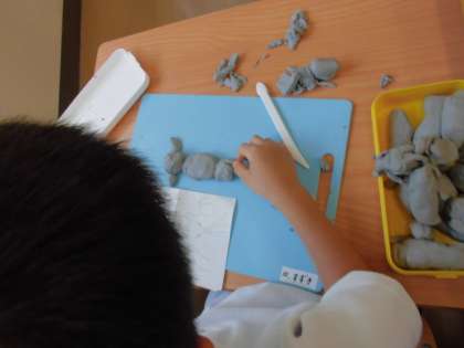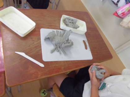 油粘土でザリガニを作っています。本物よりも随分と大きいのでまるで伊勢海老のようでした。