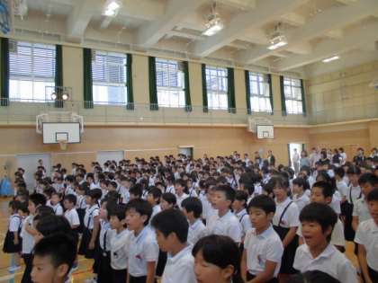 今日で1学期が終わり、明日から夏休みが始まります。9時50分から講堂で第1学期終業式を行いました。