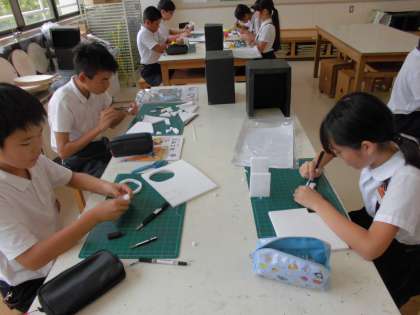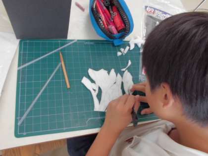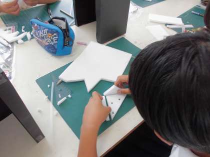 スポンジを材料にして様々な形を作っています。出来上がったものは暗い箱の中に入れて光を当てて鑑賞します。