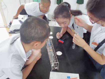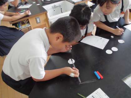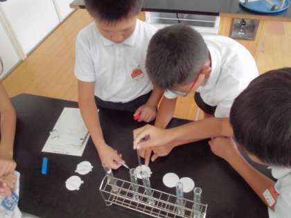 「食塩水」「炭酸水」「うすい塩酸」「うすい水酸化ナトリウム水溶液」「石灰水」をリトマス氏につけて色の変化を観察しました。「おお!変わった!」と感動している場面もありました。