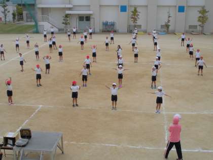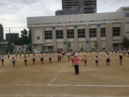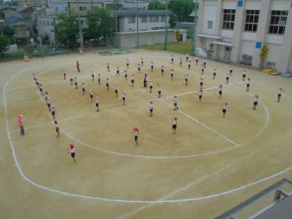 今日は、運動場で練習しました。これまでの講堂での練習とは違い、自分の立ち位置や隊形を覚えるために、広い運動場(本校の運動場はそれほど広くはありませんが)で練習を行いました。