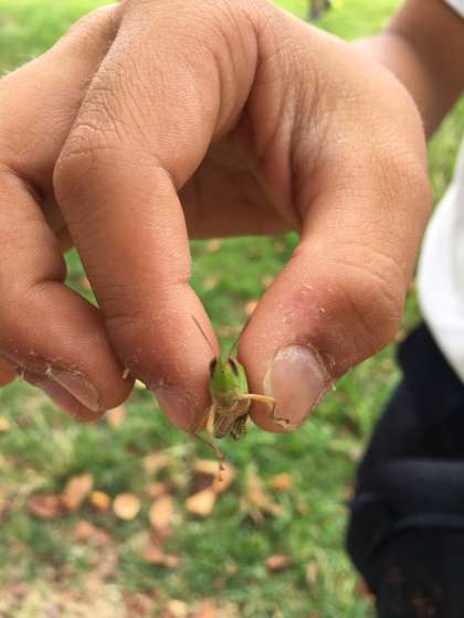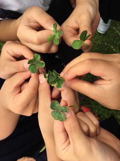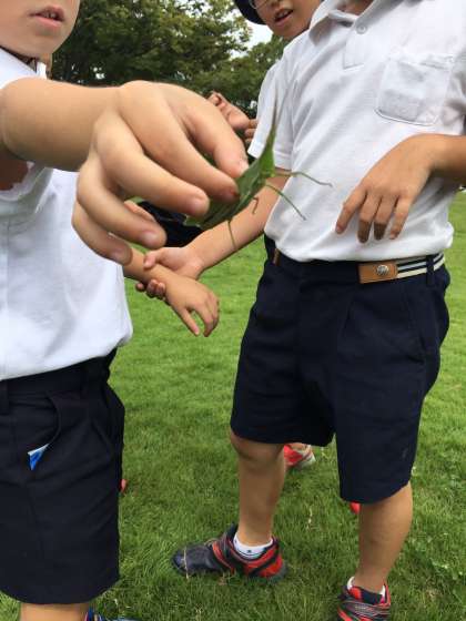 お弁当の後は、広場で四葉のクローバーを摘んだり、バッタをつまかえたりして遊びました。