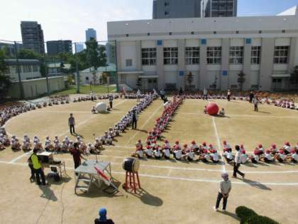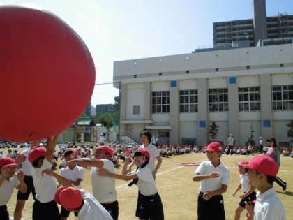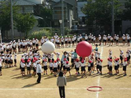 全校児童が紅組と白組に分かれて、全校競技「大玉はこび」を行います。1〜3年生は転がして、4〜6年生は持ち上げて送っていきます。
