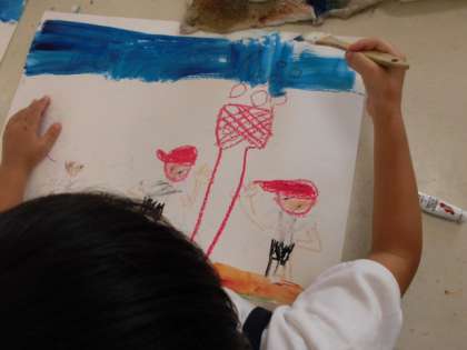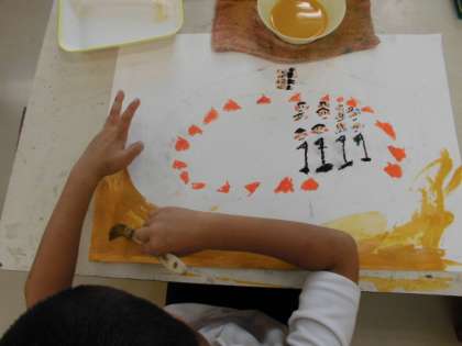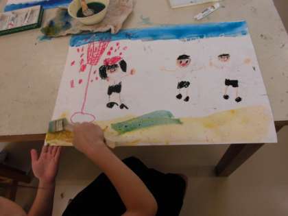 うんどうかいの絵」の背景を塗っています。広いので刷毛を使って絵の具で塗っています。